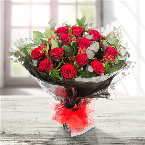 12 long stemmed velvety red roses mingled with mixed foliage, presented with a complementary wrap.