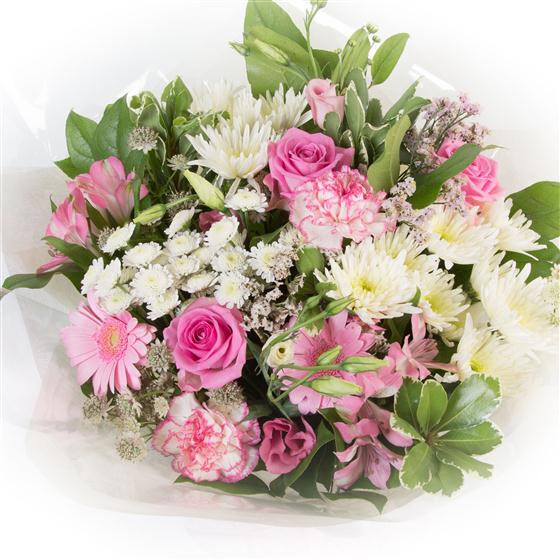 Our most popular bouquet, a collection of blooms in shades of pink and cream, hand-tied and finished with a complementary wrap.