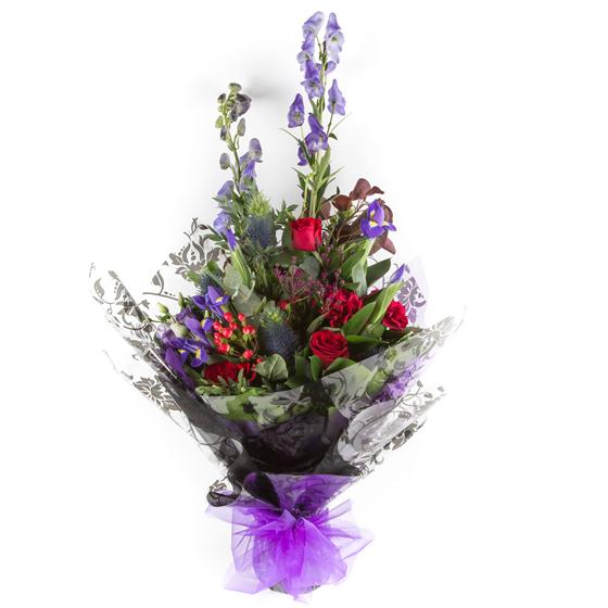 An impressive hand-tied bouquet in shades of red and purple including aconitum, eryngium, iris and roses.