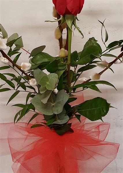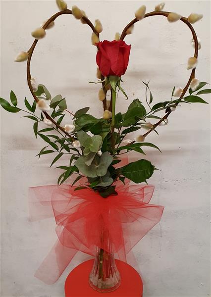 Single red rose arrangement in a glass bud vase surrounded by a Willow Heart.