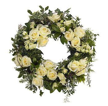 A beautiful white Rose wreath with a generous mix of foliage.14"£105